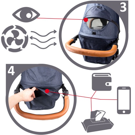 Великий балдахін можна збільшити, завдяки чому він захистить вашу дитину від холодного вітру. У задній частині кабінки є віконце для контакту з дитиною, щоб ви завжди могли стежити за ним і кишенька для дрібниць.