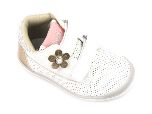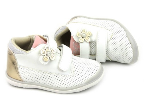 Біла модель прикрашена золотистими елементами і милою квіткою на липучці.