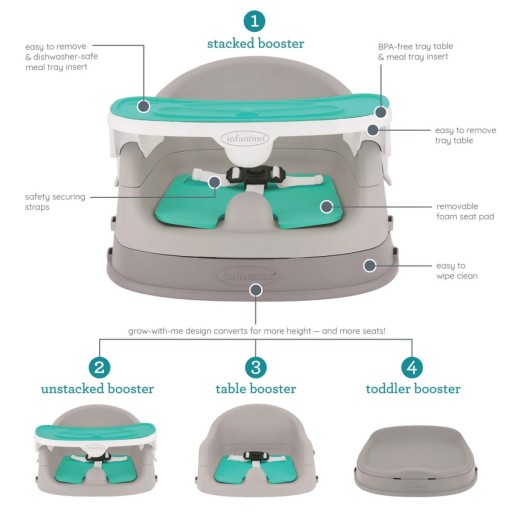 Немовлятам і батькам сподобається це подвійне, надзвичайно зручне крісло-бустер. Автокрісло Grow-With-Me 4-в-1 з двома банками та підносом перетворюється на дитяче сидіння-бустер, щоб двоє малюків могли їсти одночасно! Це крісло-бустер можна легко прикріпити до обіднього стільця, і ваша дитина зможе сидіти за столом. Завдяки функції grow with me крісло можна використовувати протягом перших років життя, від немовлят до малюків. Зростаючі сім’ї знайдуть його простий, компактний дизайн, який можна складати та розділяти, дуже корисним для закусок і їжі. У складеному вигляді дитячий бустер забезпечує додаткове збільшення висоти для маленьких дітей.