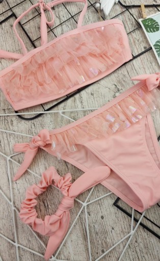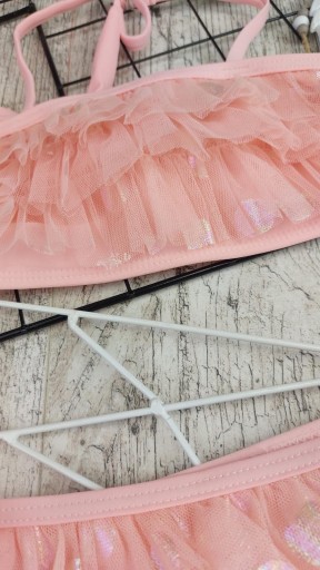 Сукня красивого персикового кольору. Ліф і трусики прикрашені ефектною оборкою з фатину, на якій красиво переливаються горошок. Гумка для волосся. Верх костюма має регульовану лямку і застібку ззаду, а також на трусах, завдяки чому його можна регулювати індивідуально.Все це просто петарда :)!