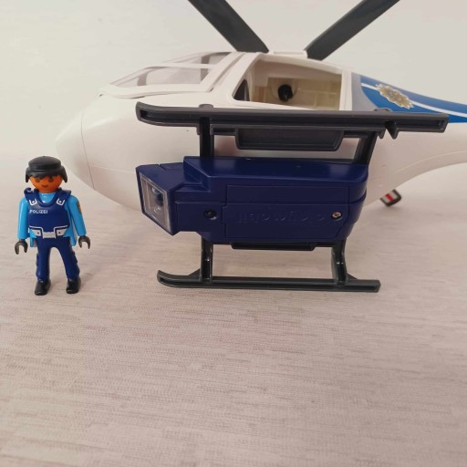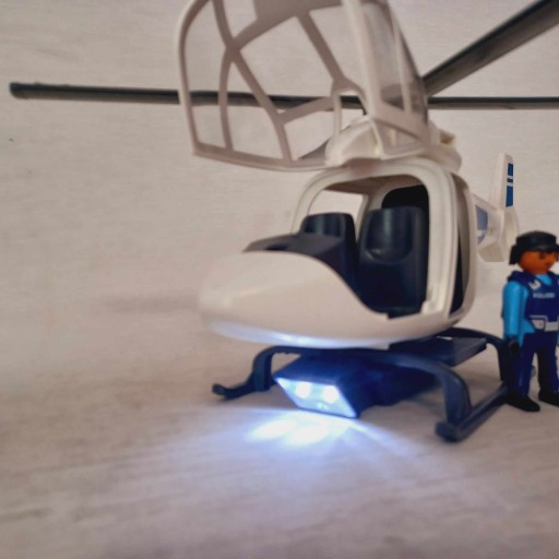 УВАГА !!! Поліцейський гелікоптер Playmobil зі світлодіодною фарою - це вживана іграшка з видимими ознаками використання, не укомплектована, йде зі змінним гвинтом пропелера. В іграшці відсутні аксесуари. Іграшка без оригінальної упаковки.