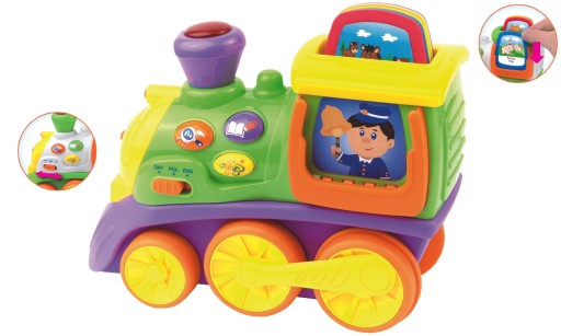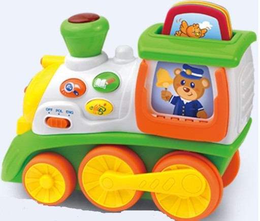 Двомовна іграшка - чудовий варіант для вивчення англійської з раннього віку. Барвистий потяг містить 6 двосторонніх карток із зображенням 12 тварин. Коли дитина натисне кнопку зі знаком питання, вона отримає вказівку знайти картку з відповідною твариною та помістити її в слот для карток. Крім того, малюк чує з картки інформацію про ту чи іншу тварину, наприклад, «Сови полюють вночі». Поїзд видає реалістичні звуки локомотива.