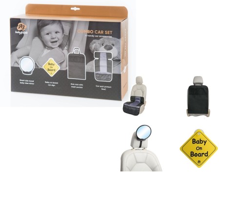 Крім того, в набір також входить практичне дзеркало, яке дозволяє спостерігати за дитиною під час водіння, а малюк бачить вас. Дзеркало має велике поле огляду та регулюється, забезпечуючи оптимальну видимість. Він виготовлений із супервідбиваючого, неблискучого пластику. Більше того, табличку «Baby on board» можна легко прикріпити до лобового скла за допомогою присоски.