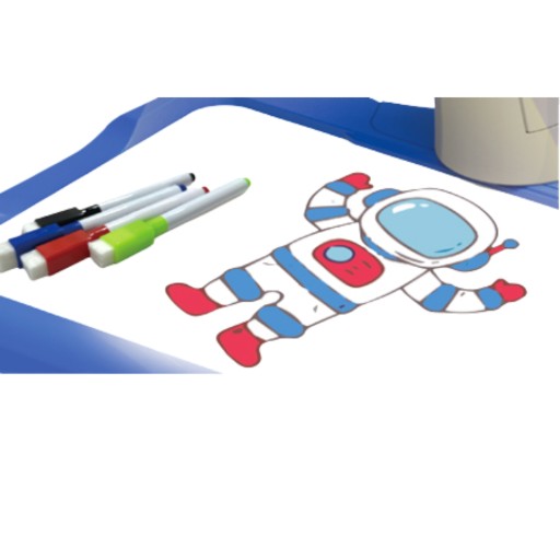 Унікальнийстілмає вбудованийпроектор, що дозволяє проектувати різні зображення на поверхню столу. Дитина може вибрати з багатьох тем, включно з мотивами космонавтів, які перенесуть її в космічну подорож, сповнену уяви та творчості. Робот має зручний перемикач, за допомогою якого вмикається світло, що створить потрібну атмосферу для творчих пошуків. Після вставлення диска зі слайдами зображення відображатимуться на основі проектора, що дасть дитині можливість обводити їх у блокноті або створювати безпосередньо на основі.