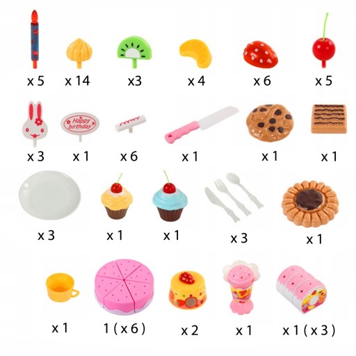 Торт для нарізки і рулет (рулет) складаються з елементів, з'єднаних між собою липучками. Завдяки цьому рішенню деталі можна з’єднувати багато разів. Барвистий нарізний іменинний торт дозволить відсвяткувати багато днів народження!
