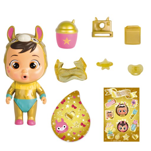 У комплект ляльки входить 8 аксесуарів золотого кольору: дитяча пляшечка, соска, браслет і крісло, а також 2 персоналізовані аксесуари, ковдра на замовлення та аркуш із наклейками.