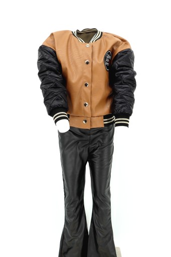 Сенсаційна куртка з ніжної екошкіри в поєднанні зі стьобаними рукавами чорного кольору. Застібається на кнопки. Збоку пришита аплікація.