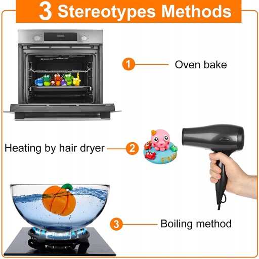 [легко працювати] Вам не потрібне жодне модне обладнання, просто скористайтеся кухонною духовкою або дотримуйтесь інструкцій, щоб розігріти свій глиняний проект за допомогою фена чи каструлі. Буклет містить кілька справді корисних методів і приємних ідей. Глина для запікання в печі легко згинається і розтягується.