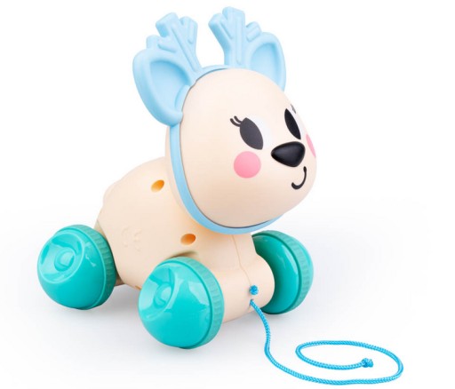 Милий олень, який готовий грати! Він має шнурок для перенесення та чотири ручки неправильної форми, які створюють цікавий візуальний ефект. Додатково ви можете їх прискорити, щоб тварина, покладене на підлогу, могло рухатися вперед самостійно. Під час їзди іграшка радісно крутить головою. На боці оленя сидить різнокольоровий метелик, який при русі видає пурхаючий звук.