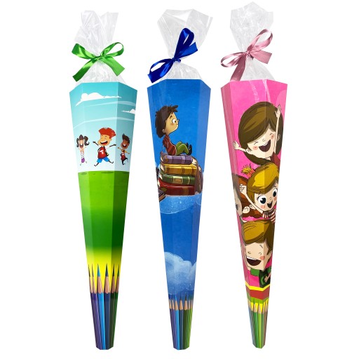 Ось ідеальна подарункова упаковка для дитини: т.зв «Кукурудза достатку» - велика картонна ємність, яку можна по вінця наповнити цукерками або шкільним приладдям. Барвиста стрічка для зав'язування бантика на наклеєній фользі захищає дрібні предмети від висипання, а жорстка вставка захищає все від зминання.