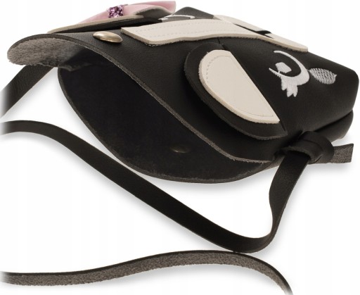 Чудова міні-сумка листоноші для дівчинки. Сумка виготовлена з екологічної шкіри, має клапан, що застібається на магніт і нашивки, що утворюють форму голови собаки. Візерунок милої собачої мордочки з вушками і бантом порадує найменших любителів моди і чотирилапих пестун.