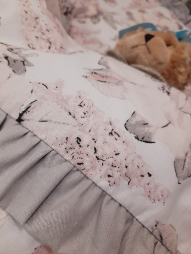 - Ретельно пришита оборка прикрашає три краї наволочки і верхню частину передньої частини підковдри.