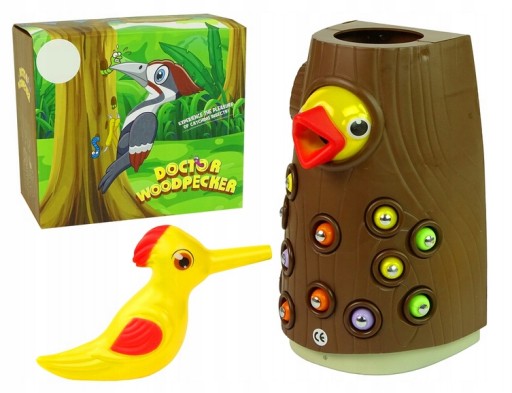 Різнокольорові жучки і пташка мають на кінцях магніти, завдяки яким їх можна рухати, тренуючи спритність. Яскраві кольори аркадної іграшки привернуть увагу дитини та спонукатимуть до гри.Завдання дитини - нагодувати голодне пташеня черв'яками і врятувати дерево від шкідниківЖовтий дятел має в дзьобі магніт, завдяки якому він притягує за голову черв’яків. Потім черв'як повинен потрапити в дзьобик пташеняті.Якщо дитині вдасться пересунути всіх черв'яків, він виграє!Курчатко нагодоване, а дерево вилікуване!