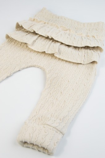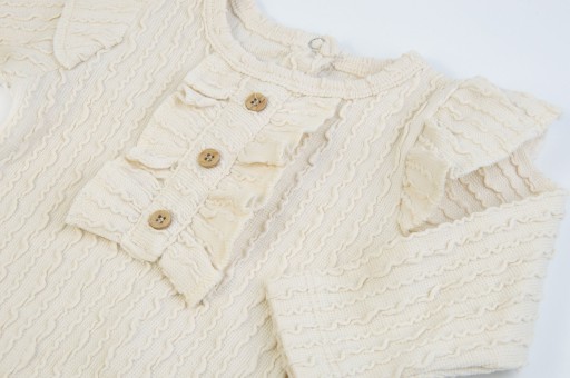 Комплект з боді та шортів виготовлений з трикотажу з ефектною перфорованою вафельною структурою з рюшами. Ідеально підійде на осінь і зиму. Комплект послужить гарним, але зручним вбранням для дівчаток на урочистих подіях, в тому числі на хрестинах.