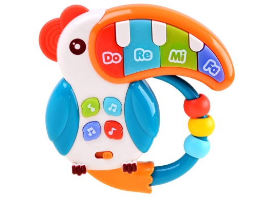 - різнокольоровий тукан - музичне піаніно, яке можна прибрати зі столу і ставитися до нього як до окремої іграшки. На дзьобику пташки клавіші з гамами (до, ре, мі, фа), чотири кнопки з нотами, грають веселі мелодії, шуми, пташині звуки, під час відтворення мелодії дзьобик тукана весело підсвічується. На ручці для пересування є різнокольорові намистини. Іграшка має двоступеневе регулювання гучності, завдяки чому ви можете налаштувати звук під свої потреби.