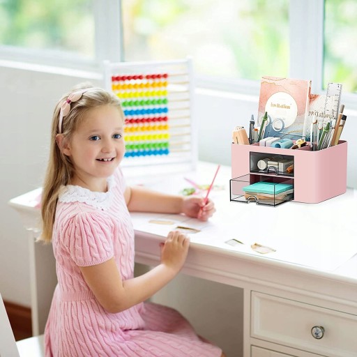 - Економія - письмовий стіл з підставкою для ручок має 5 відділень різного розміру та 2 висувні ящики, які допоможуть вам краще спланувати та використовувати простір вашого столу. Тримач для ручок не займає багато місця, тож ви можете піти з безладом на своєму столі та зайнятися своїми щоденними завданнями.