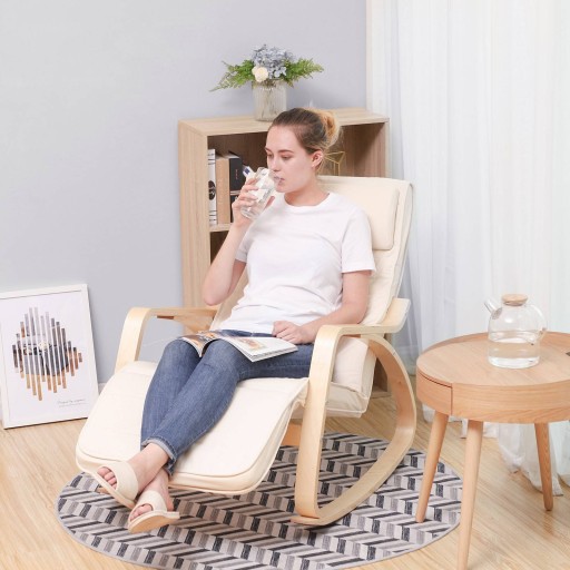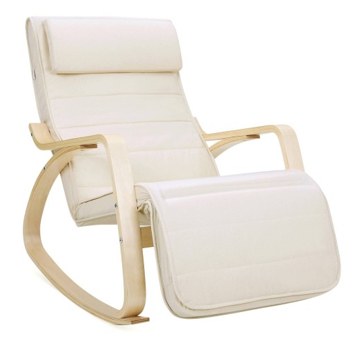 Крісло-гойдалка з березової деревини з регульованою підставкою для ніг і красивою бавовняною оббивкою бежевого кольору ідеально підходить для вітальні, спальні або вітальні.