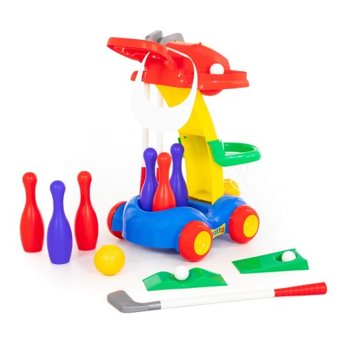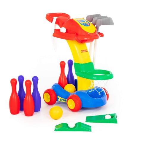 - У набір входять: ключки, 3 штампи для гольфу, аксесуари, 6 кеглів, 2 піки, баскетбольне кільце з піками.