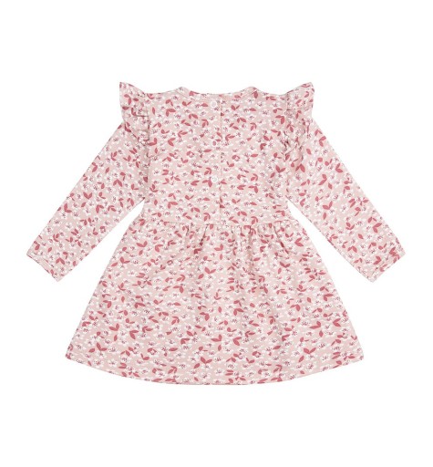 Класична, дуже елегантна сукня з високоякісної вишуканої бавовни. Мотив із дрібними квіточками на ніжно-рожевому фоні дуже делікатний і тонкий. Сукня з довгими рукавами приталена зверху та розкльошена від талії донизу. Руки прикрашені декоративною оборкою. Модель застібається ззаду на три засувки.