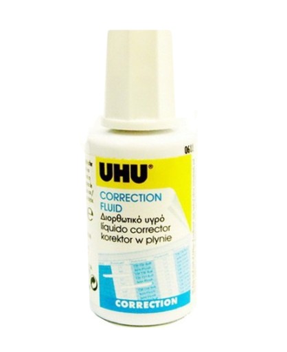 Рідкий коректор UHU з пензликом для швидкого і точного виправлення рукописного або друкованого тексту.