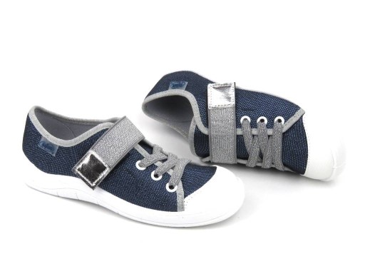 Польське дитяче взуттяБефадовиготовлений із зручного, повітряного матеріалутканинитемно-синього кольору. М'яка підкладка також виконана з тканини. застібкана липучкахдозволяє швидко і зручно надягати, aеластичні шнуркивідрегулюйте верх до стопи.Гумовий нісзахищає пальці та запобігає натиранню.Жорсткий каблукпідтримує правильне положення стопи дитини.Легка, гнучка підошвадобре прилягає до землі.