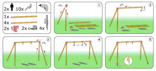Думаєте, як зробити дитячий майданчик? Ви не знаєте що вибрати? Вам більше не потрібно про це турбуватися! Цей повний набір аксесуарів дозволить вам побудувати ігровий сад. Тут ви знайдете квадратні дерев’яні з’єднувачі, чотири стропи для гойдалок, гойдалки «вороняче гніздо», гойдалки з класичним сидінням, чотири анкери для стабілізації ніжок гойдалок і двадцять шурупів TORX по дереву 8x80 мм.