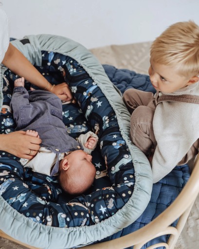 Кращий кокон Nest Velvet On the Road La Millou. Багатофункціональний дитячий кокон, створений з любов'ю до дітей: щоб у малюка завжди було своє окреме, дружнє місце для ігор, сну та відпочинку під пильним оком батьків. Малюк, що лежить в коконі, може проводити час з батьком, супроводжуючи його під час різних занять, таких як робота, відпочинок на дивані, купання і навіть під час прогулянок на свіжому повітрі. Він ідеально підходить для подорожей, немовлятам іноді важко справлятися з незнайомими місцями та новим середовищем, завдяки нашому кокону дитина завжди може мати власне місце для відпочинку з ними. Внутрішня частина бортів і низ виготовлені з повітряної бавовни, а зовнішня частина - з м'якого і повітропроникного елегантного оксамиту. Боковини наповнені м'якою силіконовою кулькою, що не викликає алергії. У нижній частині кокона ми вшили тканинну пружину, тому кокон можна сміливо прати в пральній машині без ризику зрушення. Кокон можна стягнути за допомогою нитки внизу, що дозволяє легко регулювати розмір. Для дітей старшого віку виріб можна розв'язати, створюючи дружню ігрову зону, яка не сковує рухів дітей. Шнурок додатково фіксується складкою, що робить його абсолютно безпечним для дитини. Наші кокони випускаються двох розмірів: звичайний і великий. Звичайна версія більш зручна і ідеально поміщається навіть у менших кошиках або насадках для батьківського ліжка. Версія Grande (якщо потягнути знизу) поміщається в петлі розміром від 60 см x 120 см, а коли застібка розгортається внизу, кокон стане затишним місцем для ігор і відпочинку навіть для маленьких дітей. років. ПРИМІТКА: дитячий кокон не можна використовувати як переноску, і дитину в ньому не можна носити. Продукт слід використовувати під наглядом дорослих.