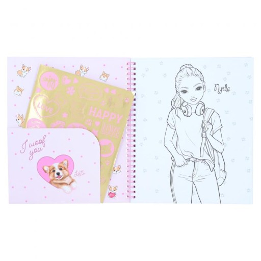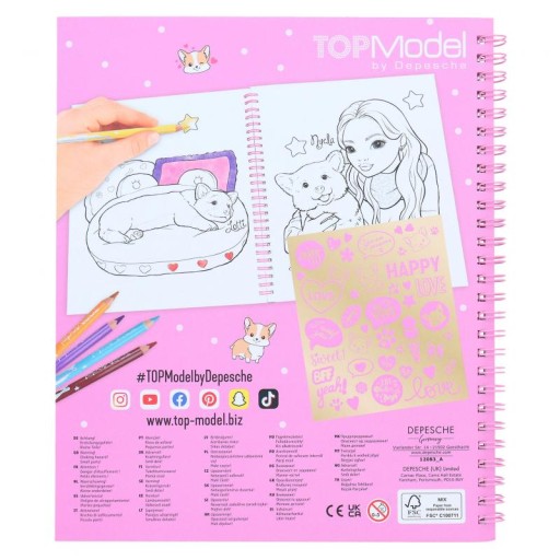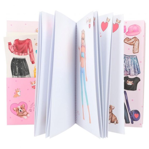 Стікербук у спіральній палітурці TOPModel Dress me up — чудовий вигляд: 7 аркушів наліпок (5x папір, 2x фольга) з модним одягом та аксесуарами для стилізації 21 фігурки моделей та їхніх пухнастих друзів.