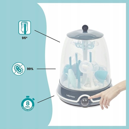 Паровий стерилізатор Turbo(+) усуває 99% мікробів, алергенів і забруднюючих речовин всього за 6 хвилин. Завдяки унікальним паровим соплам гаряча пара 95° досягає дна пляшки, забезпечуючи таким чином ретельне очищення пляшки. Насадку можна зняти і використовувати як сушарку.