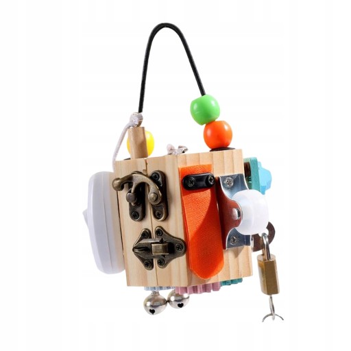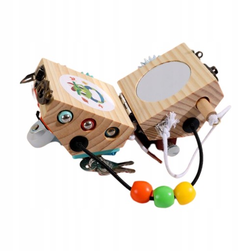 Іграшки 14-в-1: цей кубик для поєднання 14 різних видів діяльності, зокрема: лов жуків, катання намистин, переміщення автомобіля, перевертання ключів, зав’язування шнурків, клацання, слухання дзвінків, перемикання вимикачів, перемикання замків тощо навички мислення та спостереження.