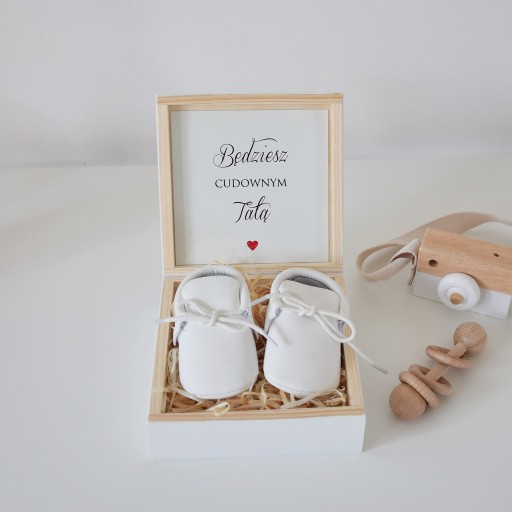 - 1 х дерев'яна коробка, біла, з вигравіруваним зовні ім'ям майбутнього батька, розмір 16 см x 16 см