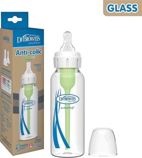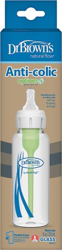 Новітня скляна пляшка Dr Brown's Options+ із вузьким горлом і соскою рівня 1. Виготовлена з боросилікатного скла фармацевтичного класу, стійкого до різких змін температури.