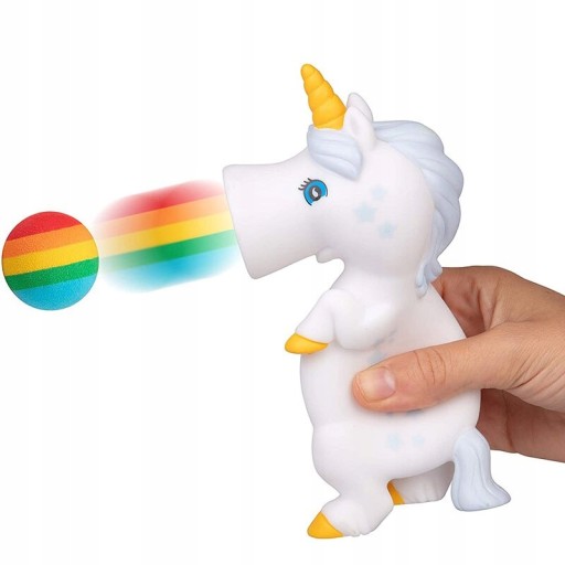 Єдиноріг squishy з райдужними пінопластовими кульками. Куля поміщається в рот єдинорога. Коли ви натискаєте на єдинорога, м'яч вилітає в повітря!