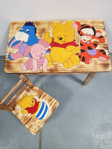 Набір складається зі столу та стільця. Меблі виготовлені з деревини ялини, дублені та ідеально виготовлені. Крім того, сидіння стільця і стільниця пофарбовані безбарвним, екологічним лаком. Цей набір може бути дуже корисним для дітей, як для прийому їжі, так і, перш за все, для гри. Казкові герої на меблях розписані вручну.
