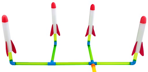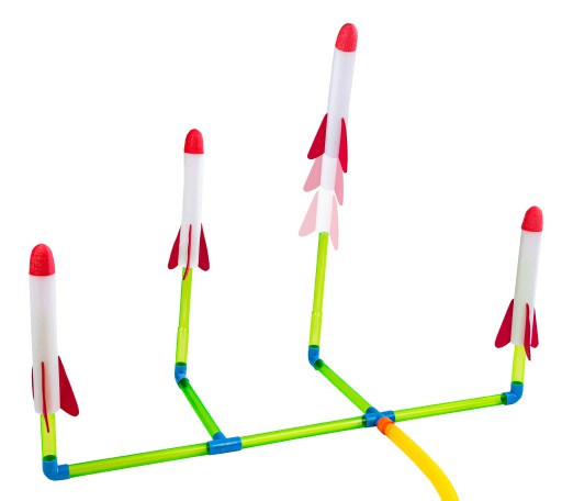 Збираємо пускову установку, з'єднавши трубки і насос. Потім розміщуємо пінні пускові пристрої на кінцях трубок. Енергійно штовхаємо ногу на насос. Задуха викликає тиск усередині трубок. Повітря знаходить вихід на кінцях труб, підкидаючи наші ракети високо в повітря. Чим сильніше ми натиснемо на насос - тим далі полетить ракета.