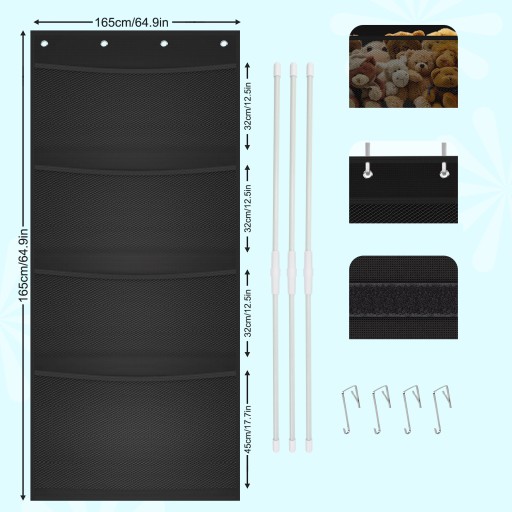 Легко повісити: Зберігання дитячих м'яких тварин дійсно підвішене, оскільки його можна повісити на корпус або приєднати до стіни всім пристроєм і не стосується місця стіни, яке розміщене на стіні, воно підходить для зберігання м'яких тварин, плюшевих іграшок тощо. Його можна скласти, коли він не використовується.