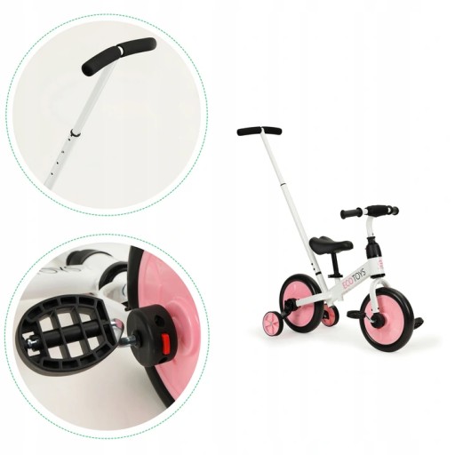 Знімні колесадозволить безпечно почати навчання водінню навіть найменшим дітям aвеликі колеса діаметром 12 дюймівзабезпечити стабільну їзду.Регульоване м'яке сидінняінеслизькі ручкипідвищити комфорт під час гри. Колеса трицикла зроблені зEVA пластик,які єстійкий до проколівтому його можна використовувати обидвавдома і на прогулянці.