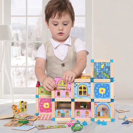 Набір дерев'яних, кольорових і безпечних кубиків для дітей від 3 років. Пакет складається з 128 елементів, які, будучи складеними, утворюють кольорові дерев'яні будиночки. Крім будівельних елементів в наборі також можна знайти блоки у формі дерева з фігурками хлопчика і дівчинки та машинками, також є графічна інструкція.
