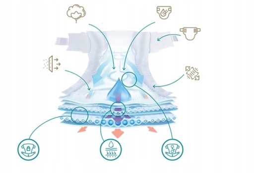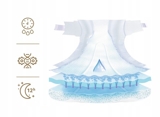 2 x більш сухий підгузник** завдяки інноваційній технології SeconDry - волога дуже швидко проникає всередину підгузника, утримуючи її подалі від шкіри вашої дитини. Завдяки цьому шкіра малюка відразу стає сухою.