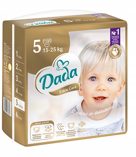 - Використання інноваційної технології SeconDRY робить підгузки до 2 разів сухішими (порівняно з попереднім варіантом Dada Extra Care)