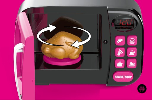 Мікрохвильова піч має дверцята, що відкриваються, і тарілку, що обертається, як у справжній мікрохвильовці.