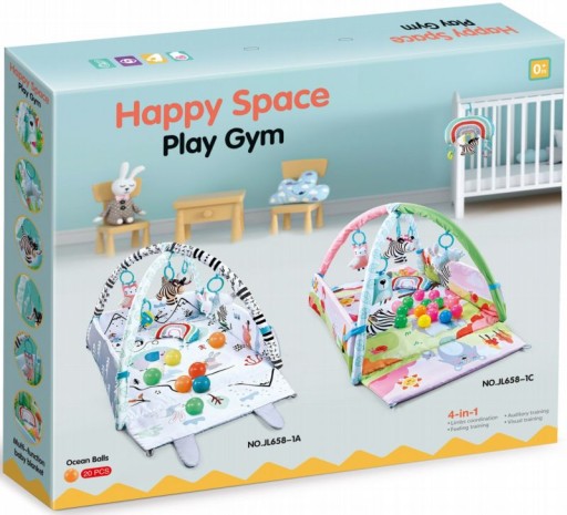 Виріб можна використовувати кількома способами, в тому числі як повністю розкладений килимок, килимок з палицями, манеж з м'ячами, манеж з відкритим боком. Іграшки, що входять в набір, мають функцію брязкання і пищання. Їх можна від'єднати і перенести в інше місце. У набір також входить подушка для животика з ручками для кріплення до неї іграшок, в наборі 20 різнокольорових кульок.