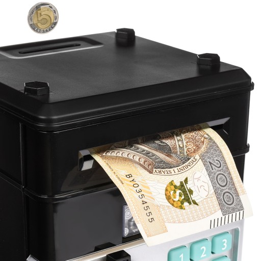 - Скарбничка має ручний монетний отвір і автоматичне відкривання, яке втягує банкноти