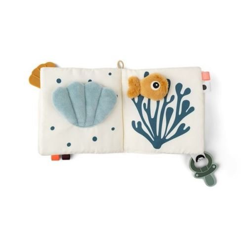 Використовуйте спеціальну ручку, щоб прикріпити іграшку вашого малюка до ігрового килимка або автокрісла, щоб він розважався в дорозі. М’яка книга світло-бежевого кольору з веселим поєднанням синіх, пудрових і гірчичних морських створінь і елементів, навіяних океаном.