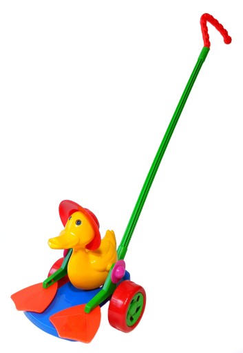 Дитина веде іграшку перед собою за допомогою прикріпленої палички.