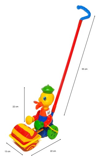 Качечка, прийшовши в рух, весело катає перед собою циліндр, ворушить лапками вгору-вниз і лунає дзвінок в колесах іграшки.