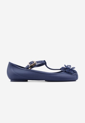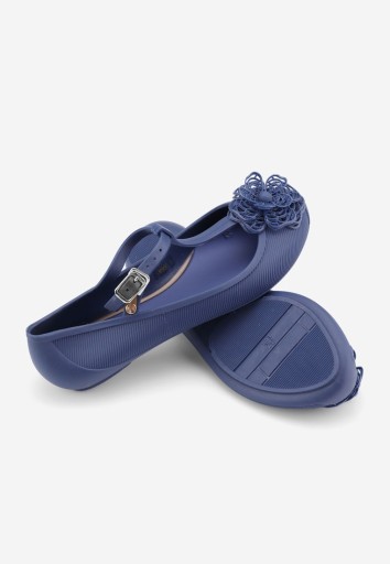 Балерини типу Meliska, на плоскій підошві, повністю з гумового матеріалу. Застібається на вузький ремінець із золотою пряжкою. На передній частині черевика є декоративна аплікація у вигляді квітки. Модель ідеально підходить як для повсякденного використання, так і для пляжу.