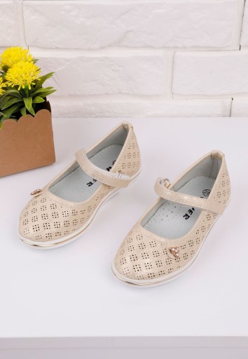 Балетки для дівчаток, на плоскій підошві. Ажурний верх з екошкіри. Круглий носок, застібається на щиколотку вузьким ремінцем. Збоку маленька аплікація у вигляді квіточки