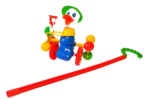 Дитина веде іграшку перед собою за допомогою прикріпленої палички.