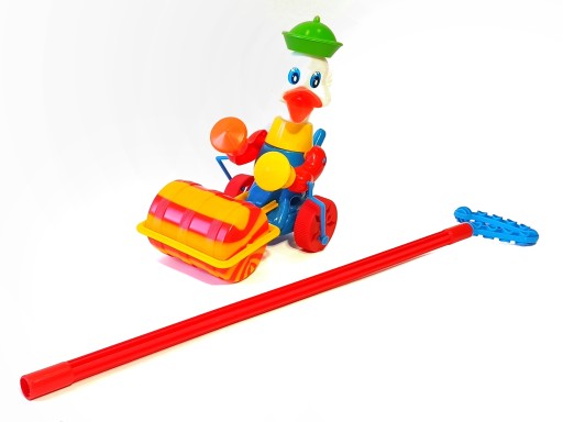 Приведена в рух качка весело катає перед собою циліндр, перебирає лапками вгору-вниз і чути дзвін у колесах іграшки.